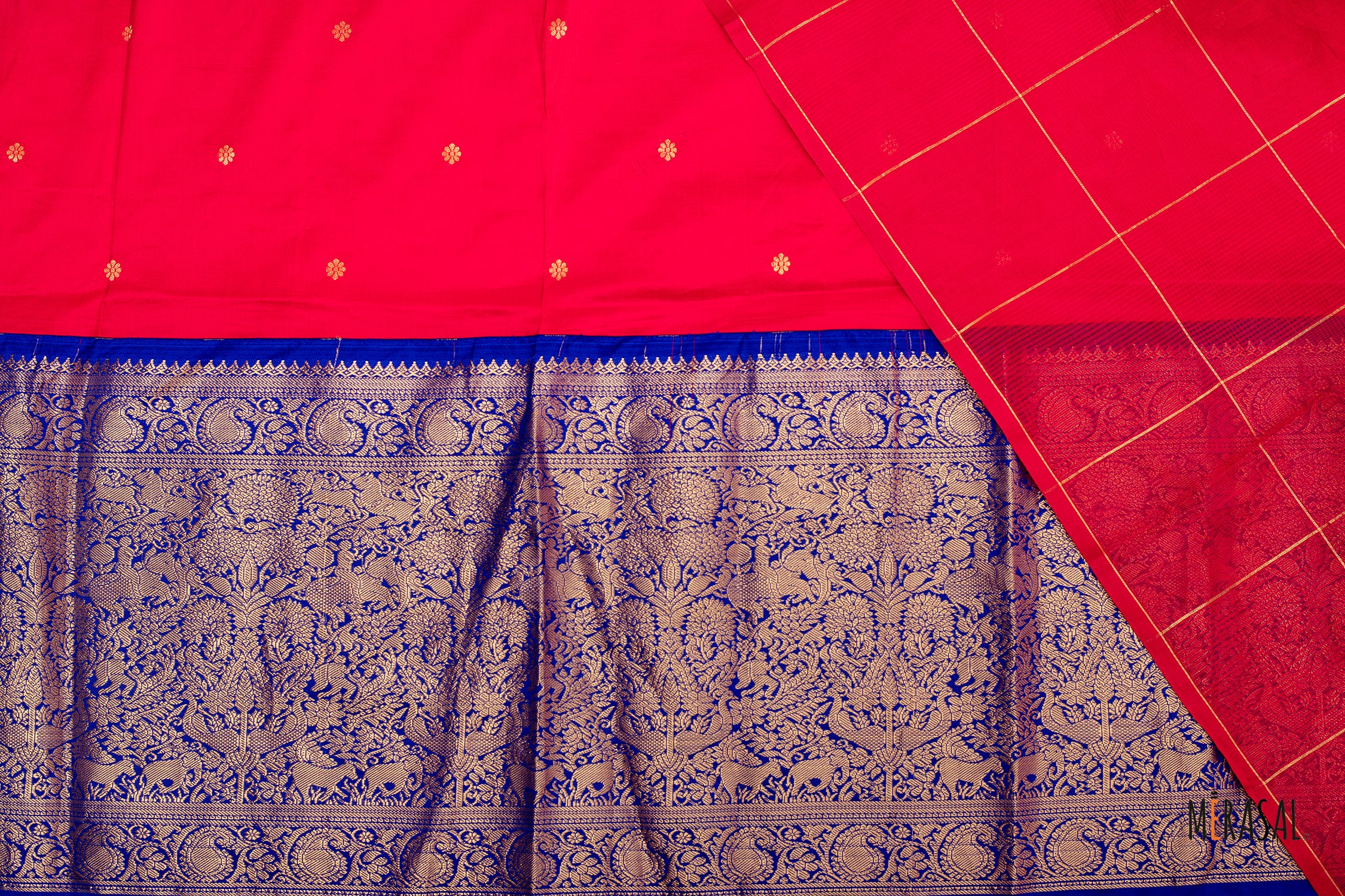 The saree is paired with a striking royal blue pure silk blouse featuring a bold, wide border, creating a sophisticated contrast that elevates the overall look. The clean checks on the body beautifully balance the grandeur of the blouse, making this ensemble versatile and effortlessly graceful.