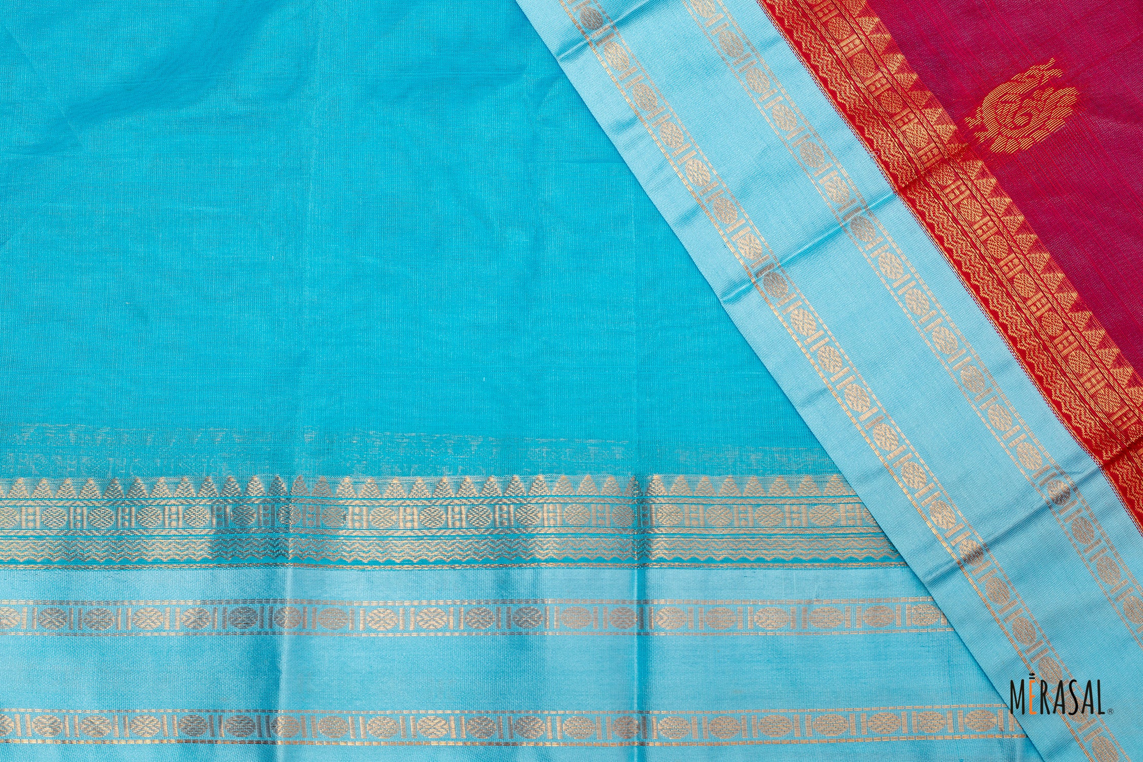 The saree is beautifully contrasted with a refreshing sky blue silk cotton border and pallu, enhanced with fine gold zari detailing. This striking colour combination brings balance and sophistication, making the saree visually appealing while remaining graceful and versatile.