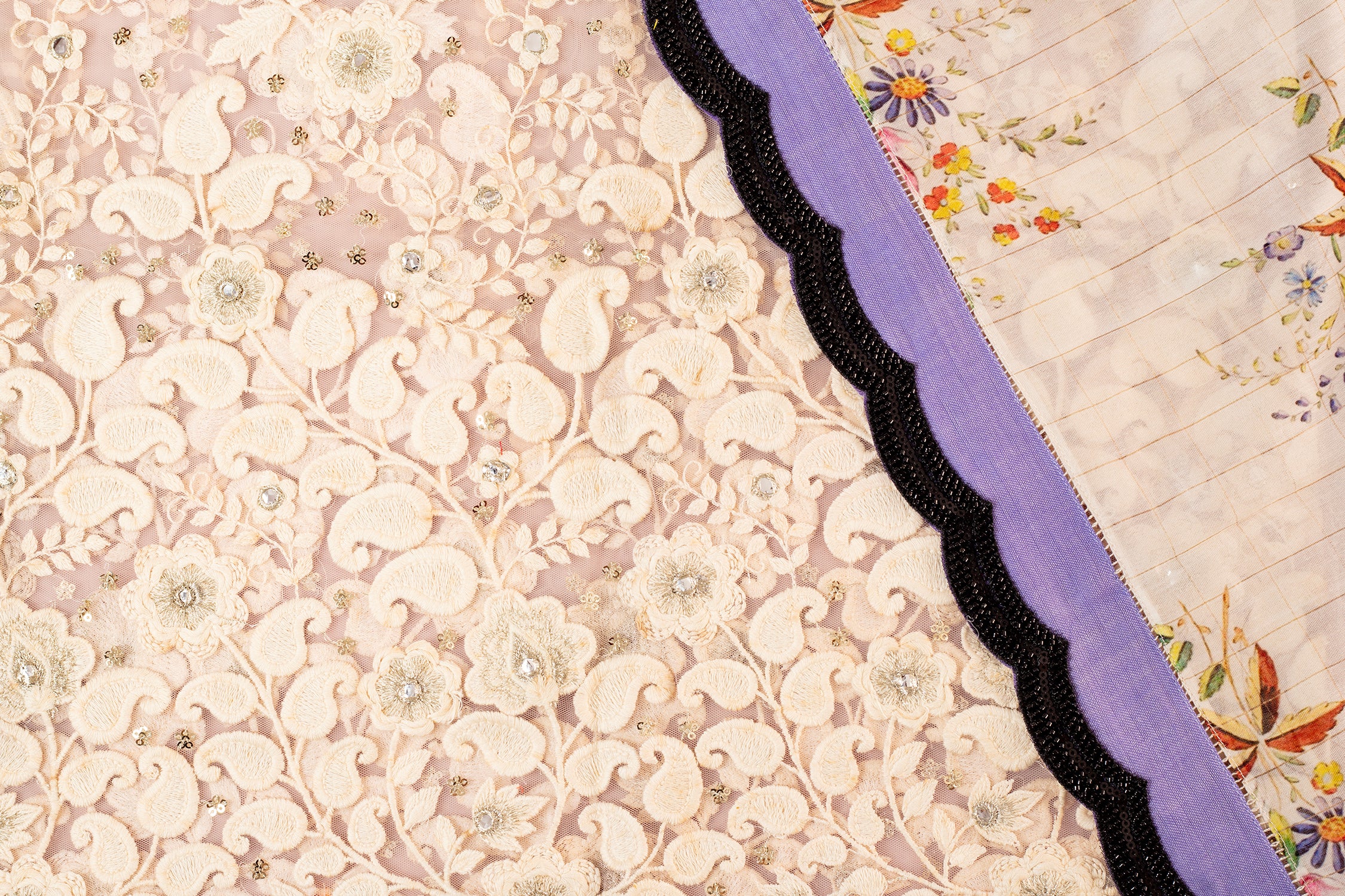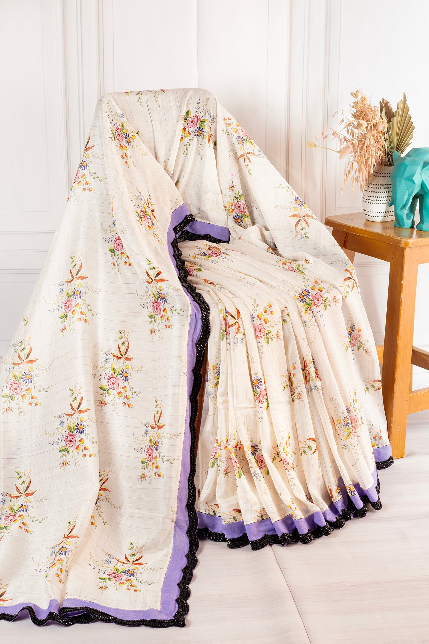 The saree features delicate all-over floral prints that add charm and femininity to the understated ivory base. It is beautifully finished with a contrasting cotton border, highlighted with black embroidery detailing that lends definition and a contemporary edge to the design. A soft lilac accent within the border enhances the overall look while maintaining a balanced, elegant appeal.