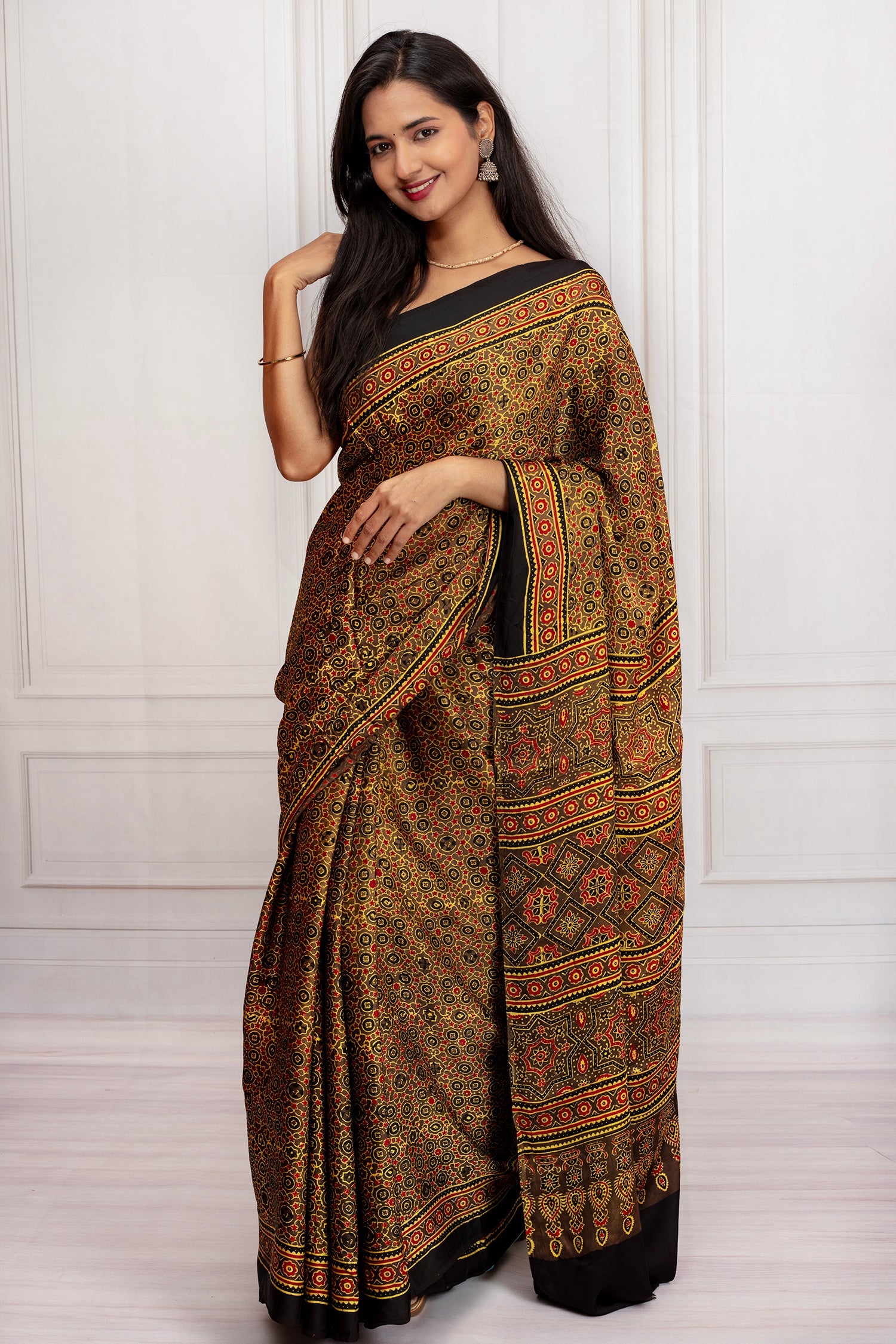 Elegant Black Ajrakh Printed Saree with Traditional Motifs. Celebrate the beauty of timeless craftsmanship with this exquisite Ajrakh printed saree. Handcrafted with intricate geometric and floral motifs in earthy tones of black, red, yellow, and green, this saree reflects the rich heritage of traditional Ajrakh art. The bold border and detailed pallu add depth and elegance, making it a perfect pick for women who love a blend of tradition and style.
