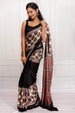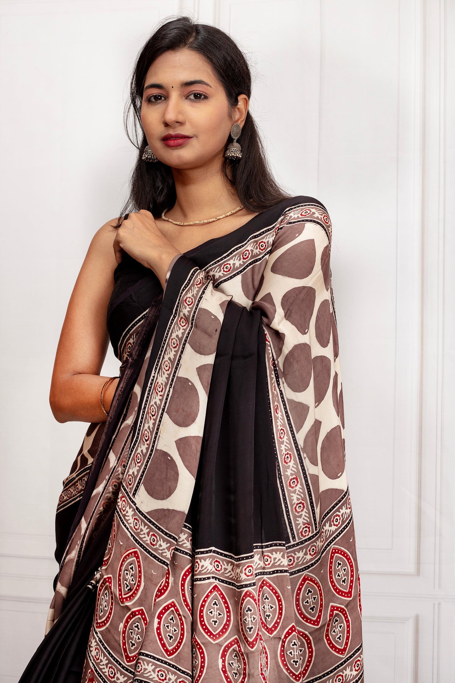 Elevate your ethnic style with this beautiful black and beige printed saree, designed to combine tradition with modern elegance. Featuring bold beige leaf motifs and a contrasting black base, this saree is highlighted with a vibrant red and brown patterned pallu for a touch of festive charm.