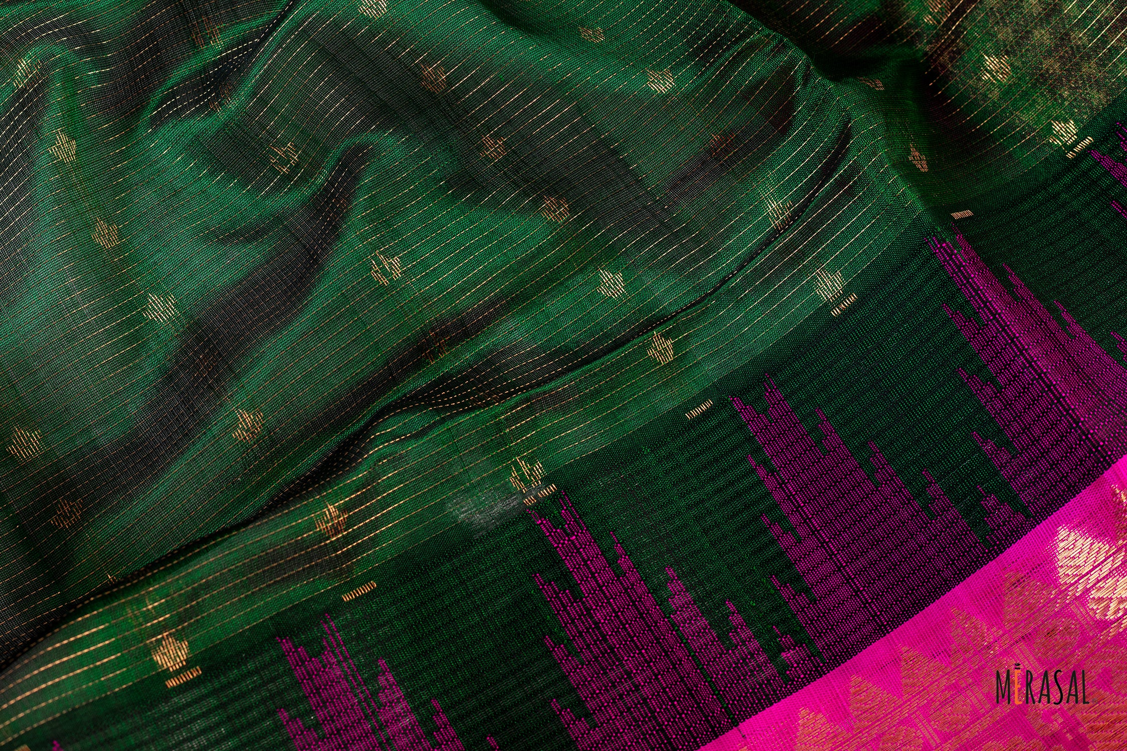 The deep emerald green body is enhanced with subtle woven motifs, adding texture and understated elegance. A striking magenta zari border and pallu bring vibrant contrast, beautifully detailed with traditional gold zari patterns that elevate the overall look. The saree drapes effortlessly, creating a refined silhouette suitable for both classic and contemporary styling.