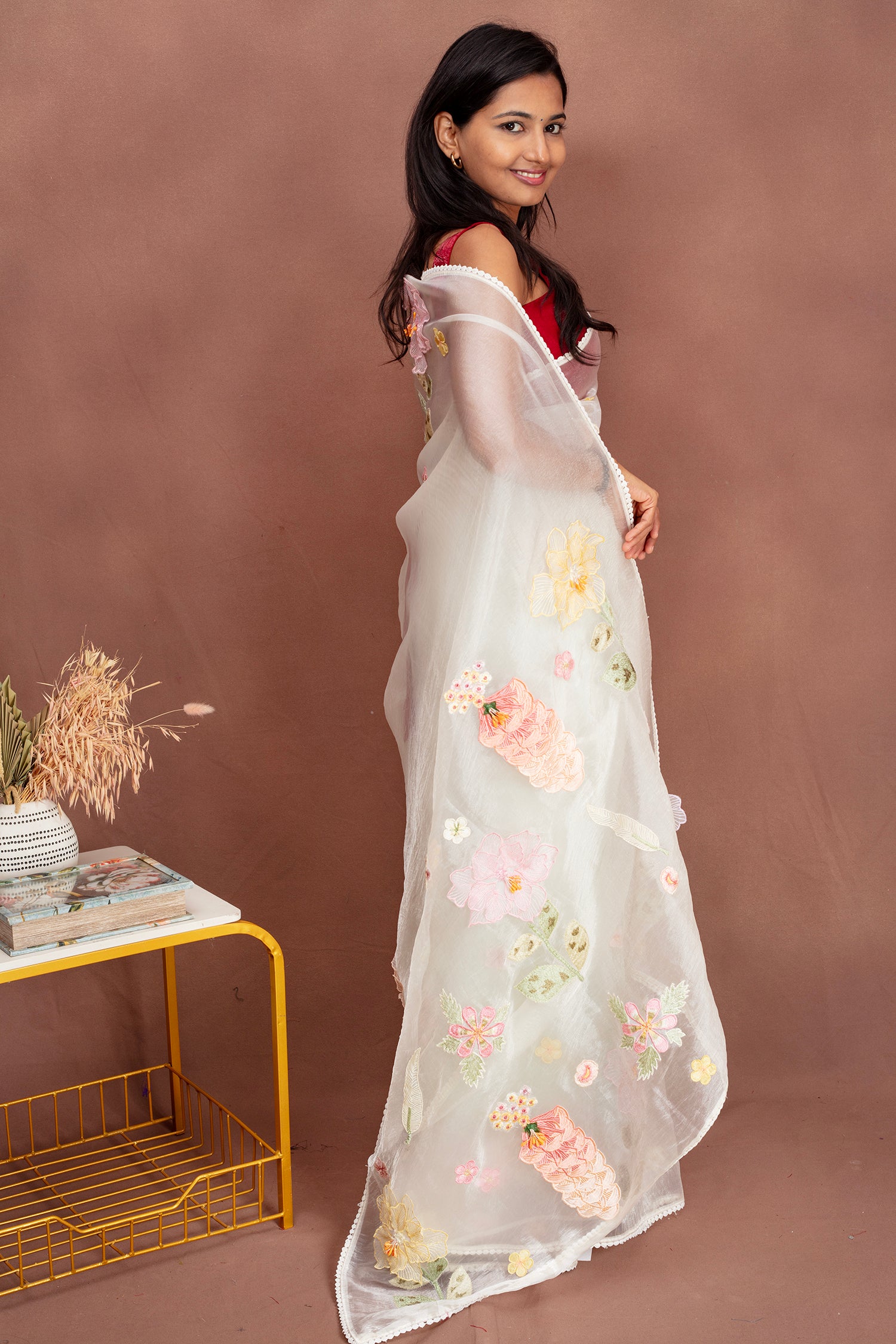 Ethereal White Organza Saree with Pastel Floral Appliqué Step into sheer elegance with this ethereal white organza saree, beautifully detailed with pastel floral appliqué work. Lightweight, flowy, and dreamy, it drapes with a soft translucence that enhances every movement. The saree features intricately embroidered flowers in shades of pink, yellow, lilac, and mint, giving it a fresh garden-inspired charm.