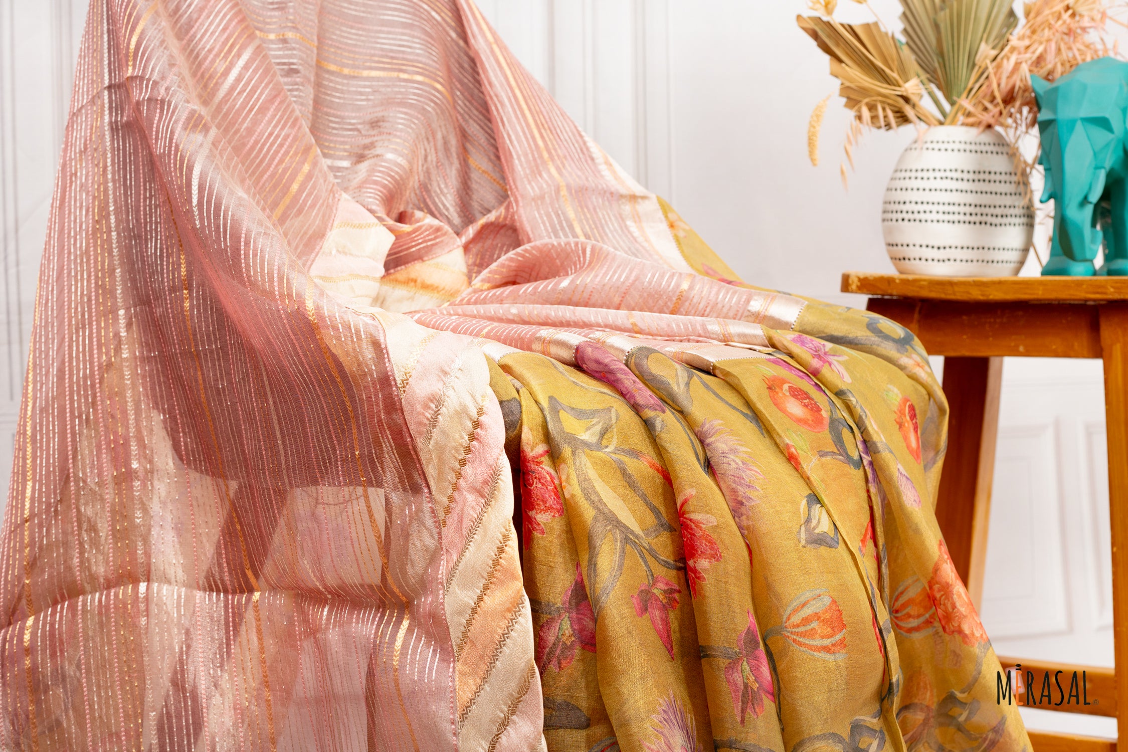 This elegant half and half tissue print saree is a beautiful blend of shimmer and softness, designed for refined festive and occasion wear. The saree features a luminous blush rose tissue pallu, woven with fine metallic stripes that add a subtle sheen and graceful fluidity to the drape. The lightweight tissue texture gives an airy, ethereal feel while maintaining a rich, premium appearance.