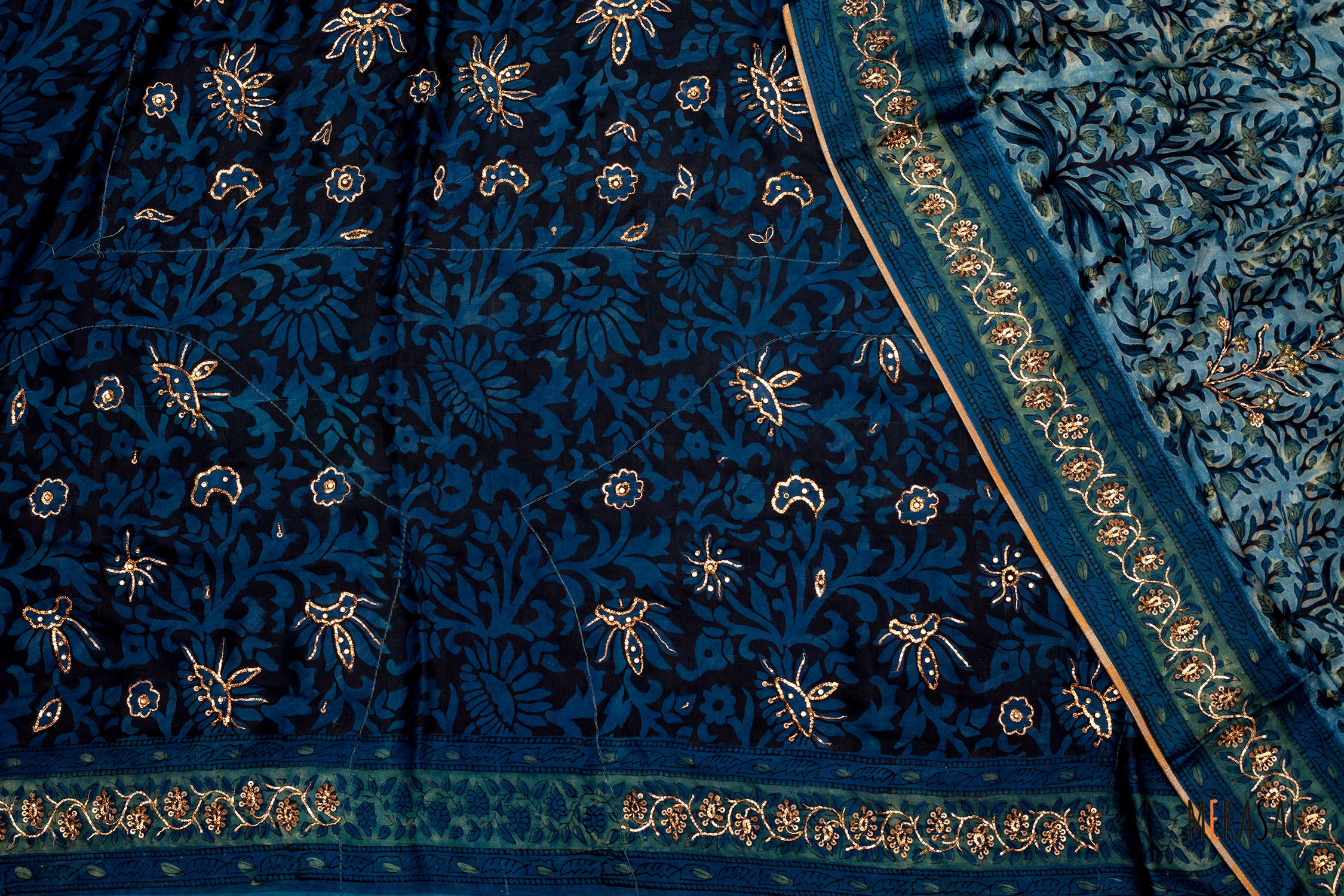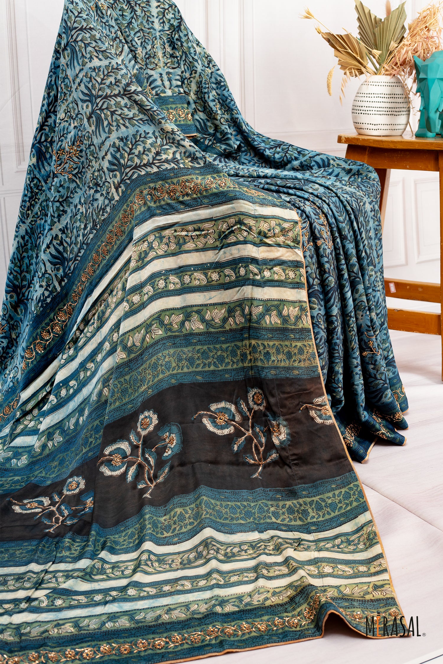 Handcrafted Ajrakh Print Saree in Teal Blue with Floral Embroidery Highlights This exquisite Ajrakh saree is a celebration of heritage craftsmanship blended with refined detailing. Rendered in a rich teal blue base with deep indigo and earthy undertones, the saree features traditional Ajrakh-inspired motifs that reflect centuries-old textile artistry.