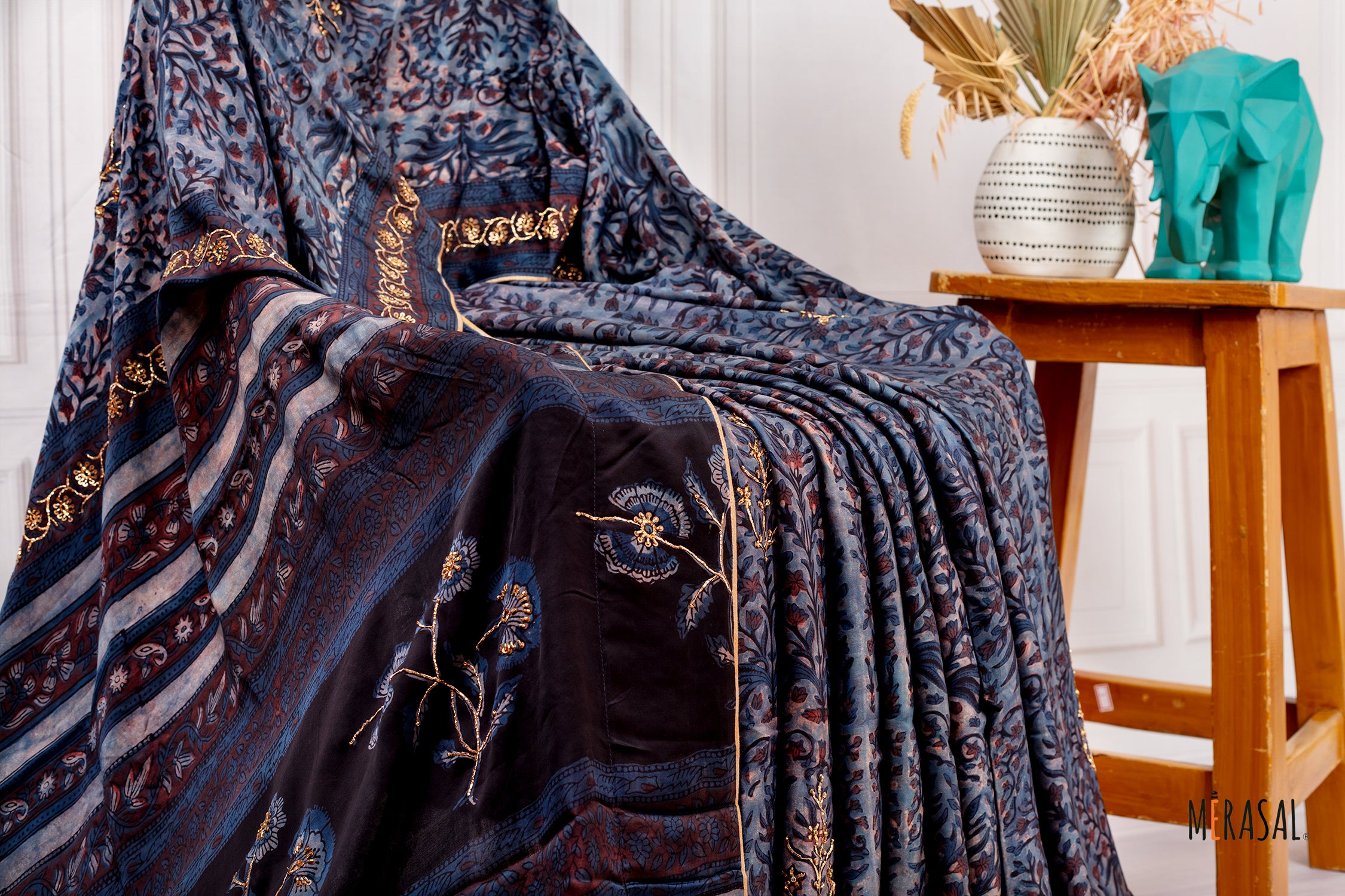 Handcrafted Ajrakh Saree in Deep Indigo–Black with Floral Embroidery Highlights This is the same Ajrakh saree design, reimagined in a deeper indigo–black palette for a richer, more dramatic look. The traditional Ajrakh motifs flow seamlessly across the body, while the floral elements are delicately highlighted with embroidery, adding texture and subtle shimmer to the otherwise earthy print.