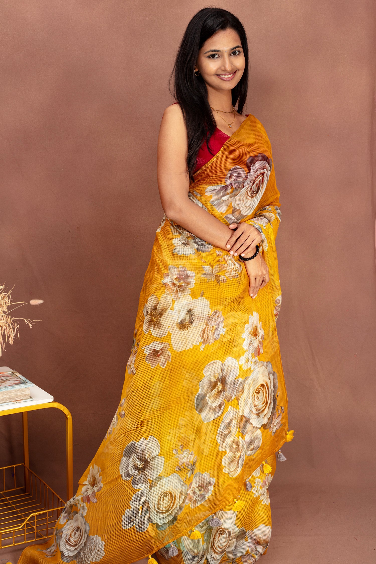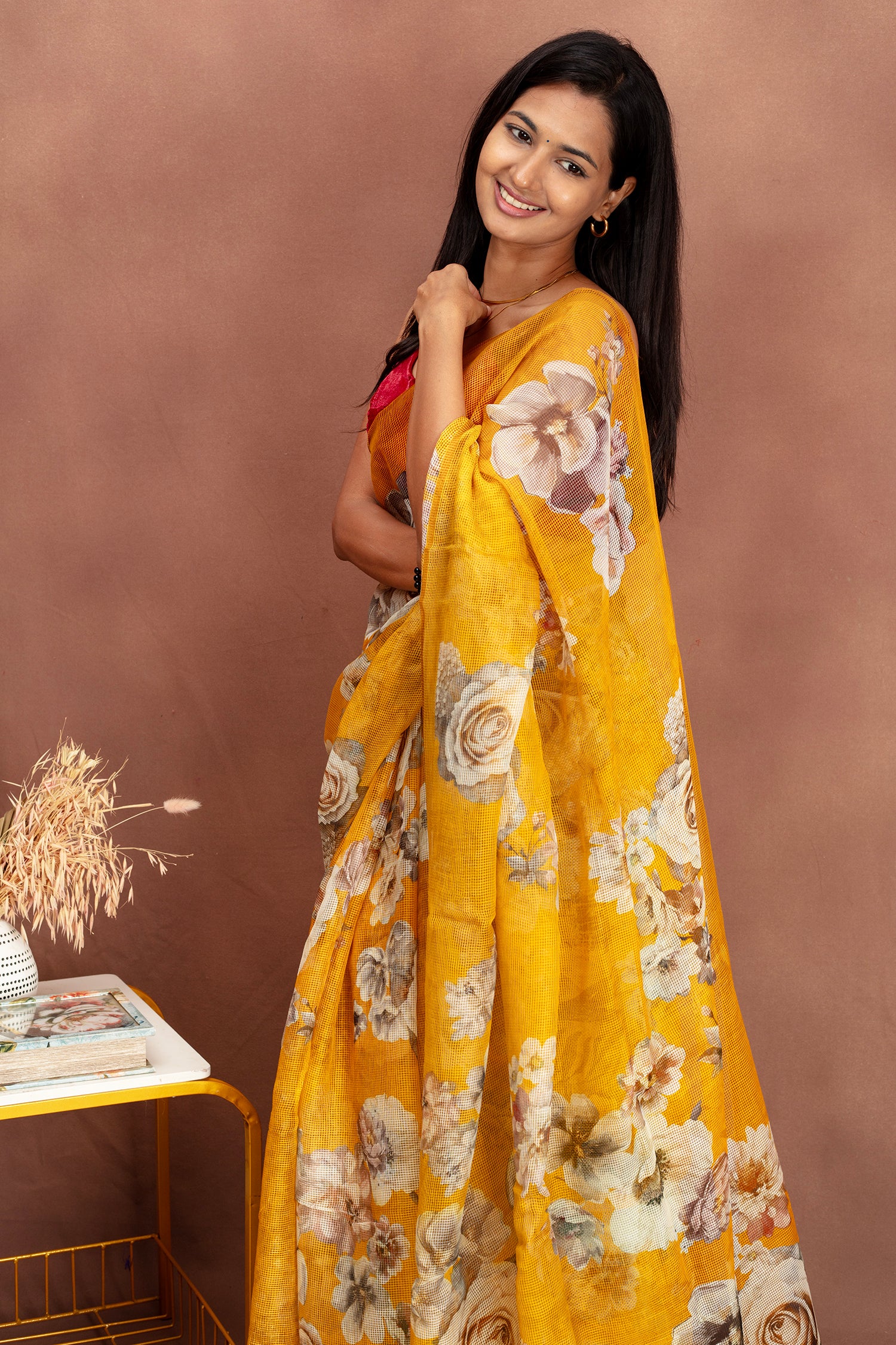 Ikat Fabric Saree – Mustard Colour Elevate your ethnic wardrobe with this graceful mustard ikat saree, beautifully blending traditional woven texture with contemporary floral charm. The saree features a rich mustard yellow base highlighted with subtle ikat patterns and soft pastel floral prints along the pallu and lower border, creating the perfect balance of elegance and freshness.