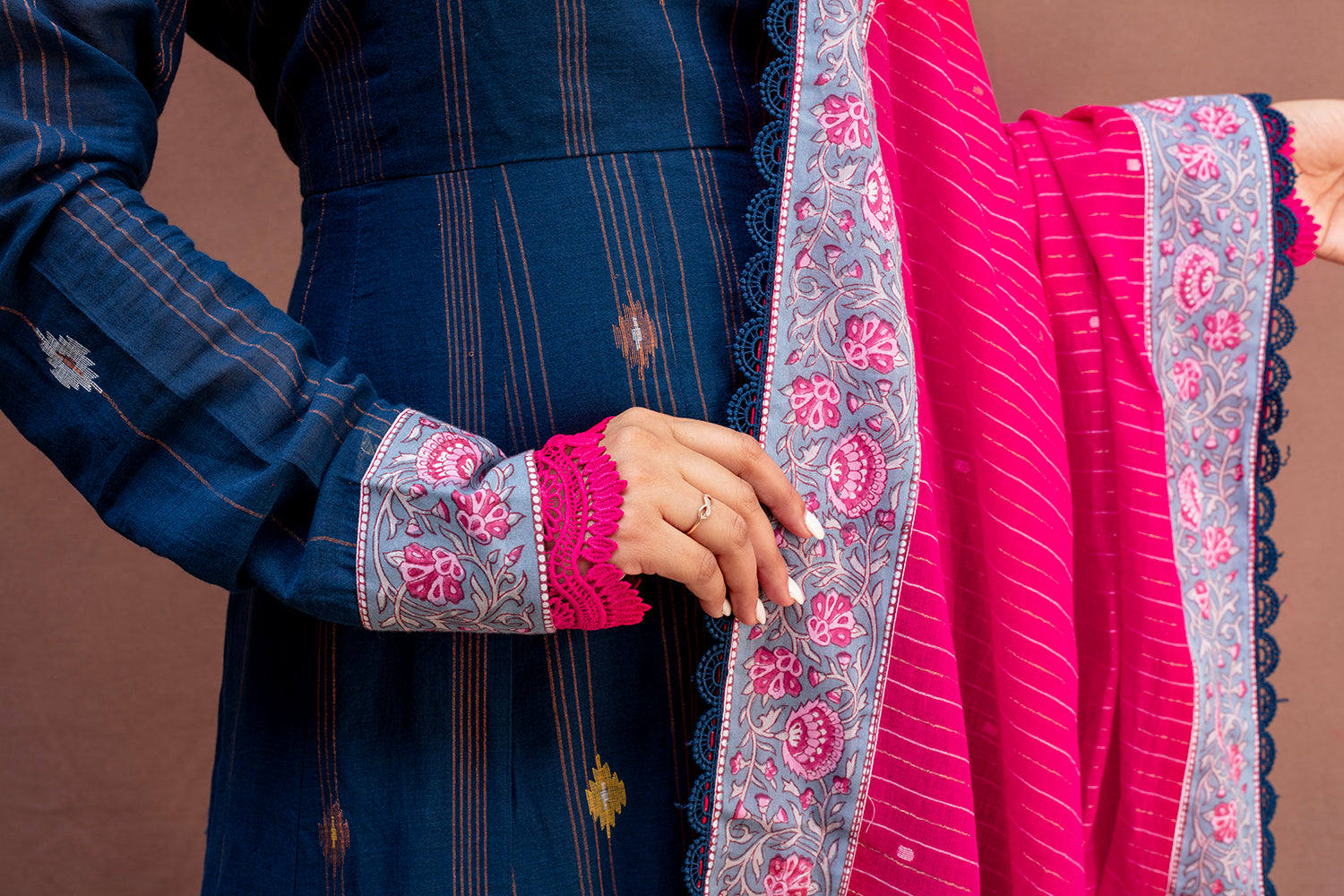Intricate Hand-Block Style Details: The navy blue Anarkali features elegant vertical stripes and delicate floral motifs. The sleeves and hemline are highlighted with a sophisticated floral border and finished with a playful fuchsia scalloped lace.