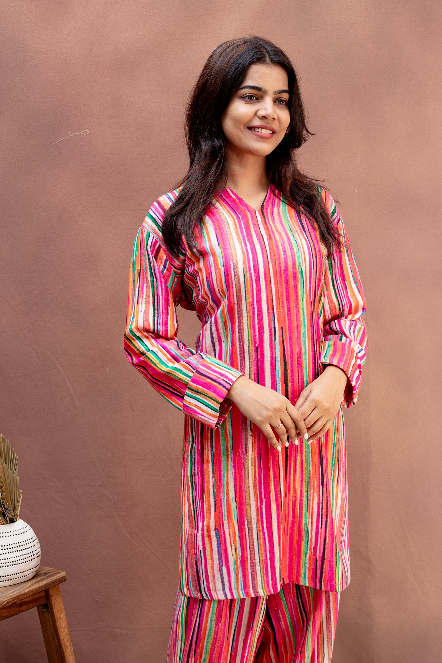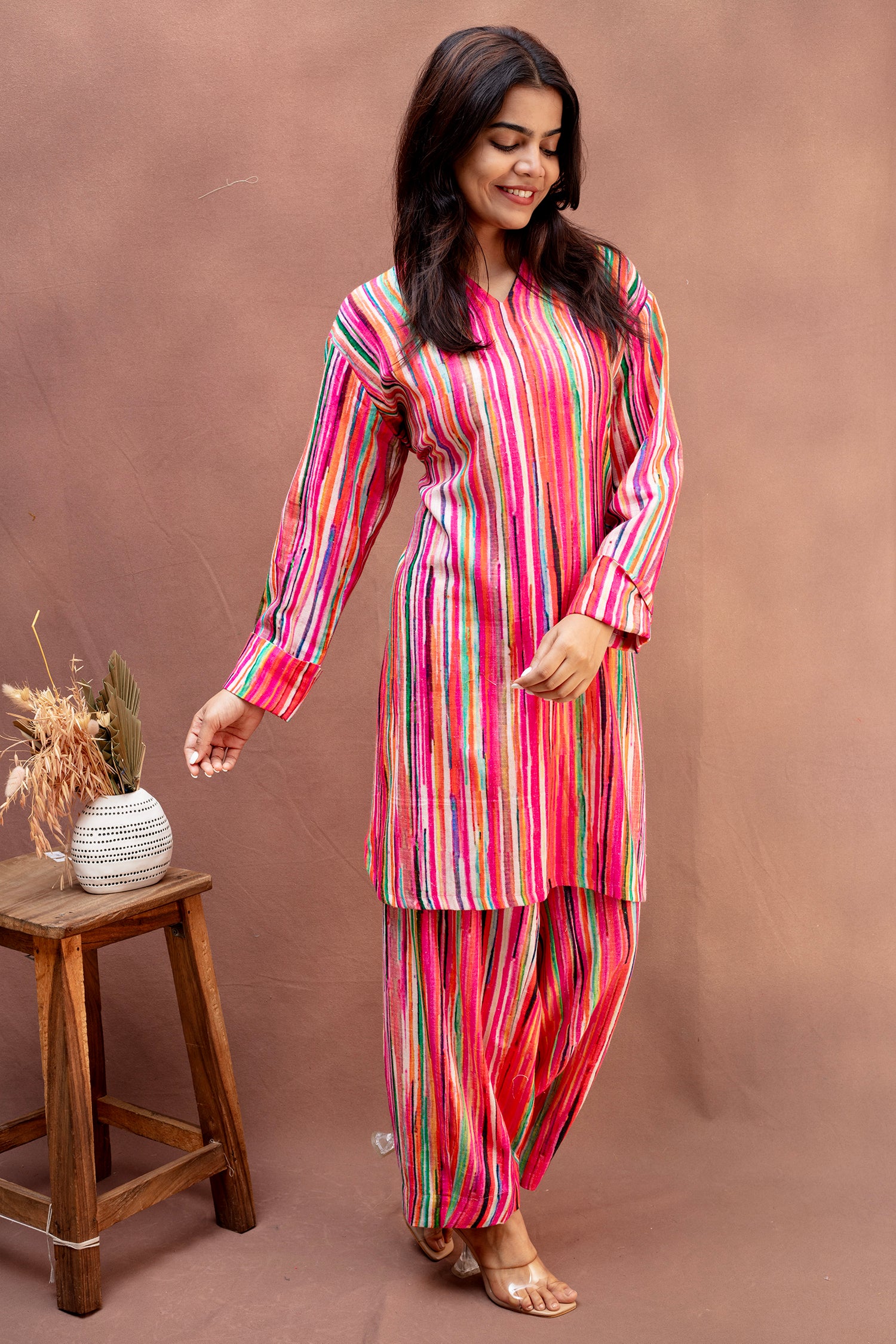 Make a bold, high-energy fashion statement with this stunning Vibrant Striped Co-ord Set. Designed for the trendsetter who loves a splash of color, this outfit seamlessly blends modern silhouettes with an artistic, multi-hued palette.