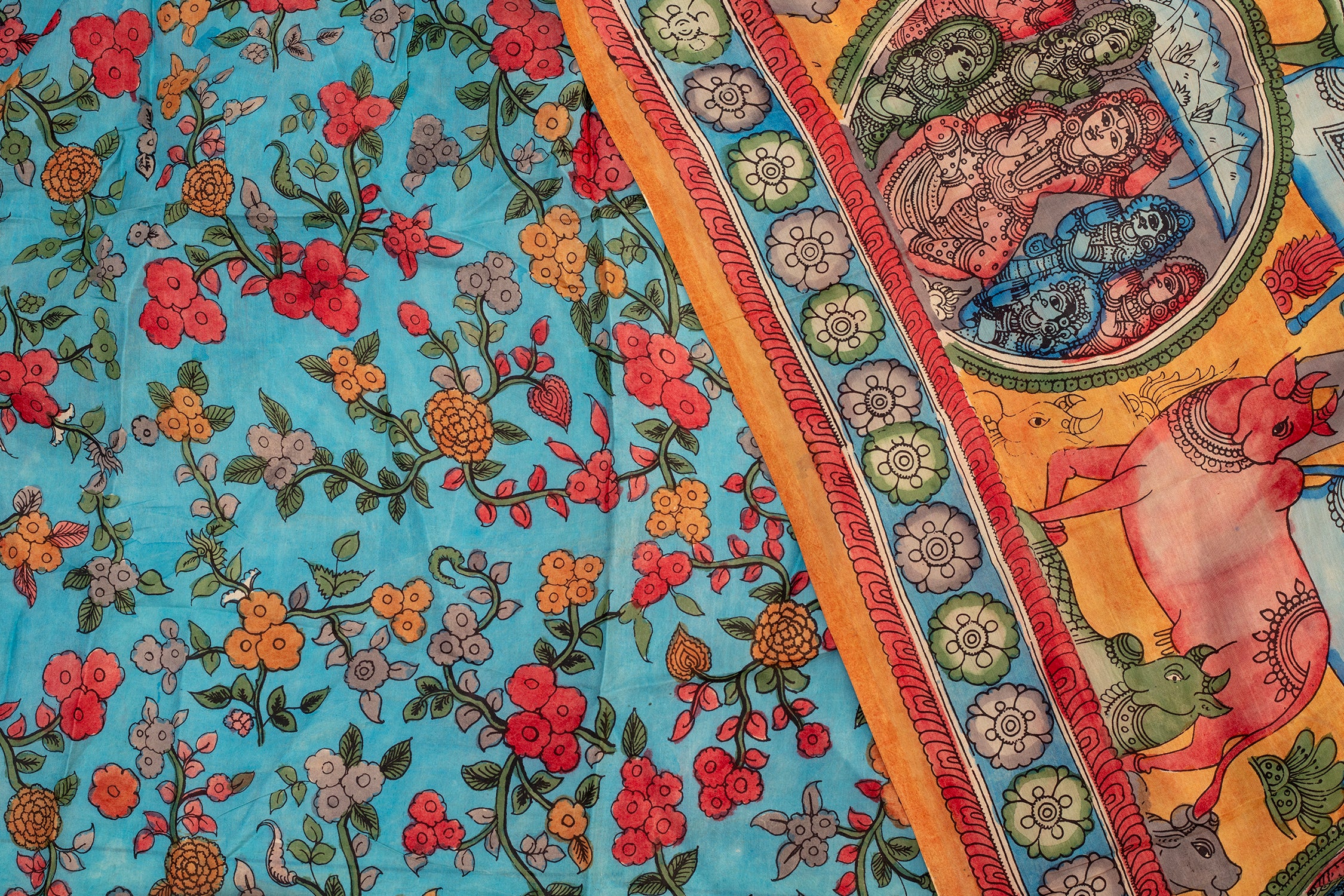 Set against a vibrant turquoise blue pallu, the saree is enhanced with a lively multicolor body in shades of coral red, mustard yellow, earthy beige, and soft green. The combination of narrative art and geometric patch-style patterns creates a striking visual contrast, making this saree truly one of a kind. The ornate borders further elevate its traditional appeal with intricate craftsmanship.