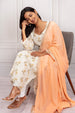 Step into sophisticated simplicity with our Ivory Floral Straight-Cut Suit. This elegant ensemble features a long kurta with a clean, streamlined silhouette, adorned with subtle yellow and green floral motifs. The delicate patterns add a fresh, natural charm to the soft ivory fabric. The full-length sleeves and a classic neckline complement the graceful, straight cut of the top. Paired with a vibrant peach dupatta that has a shimmering gold border, this outfit creates a striking and balanced look. Perfect for a festive occasion or a semi-formal event, this suit is a beautiful blend of traditional design and modern comfort.