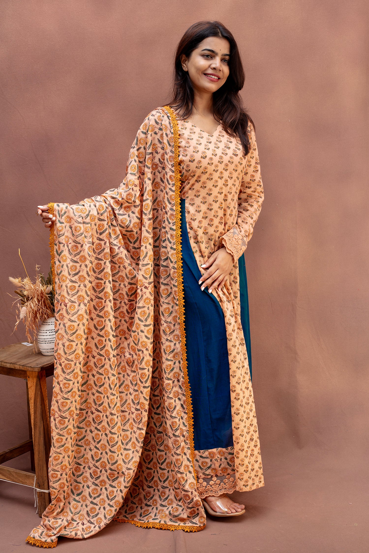 Embrace a soft, feminine aesthetic with this beautifully tailored Pure Cotton Anarkali ensemble. This stitched set features a delicate play of warm peach and deep teal, highlighted by intricate lace details for a sophisticated, romantic look.
