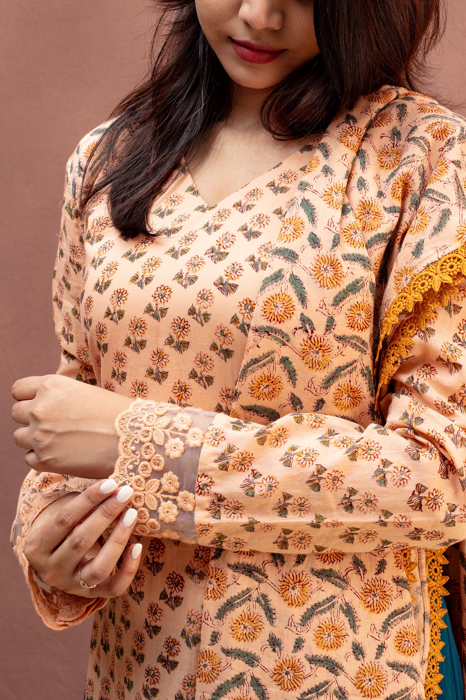 Coordinating Floral Dupatta: The set is completed with a matching peach floral dupatta, finished with a delicate yellow-gold lace trim that ties the entire color palette together beautifully.