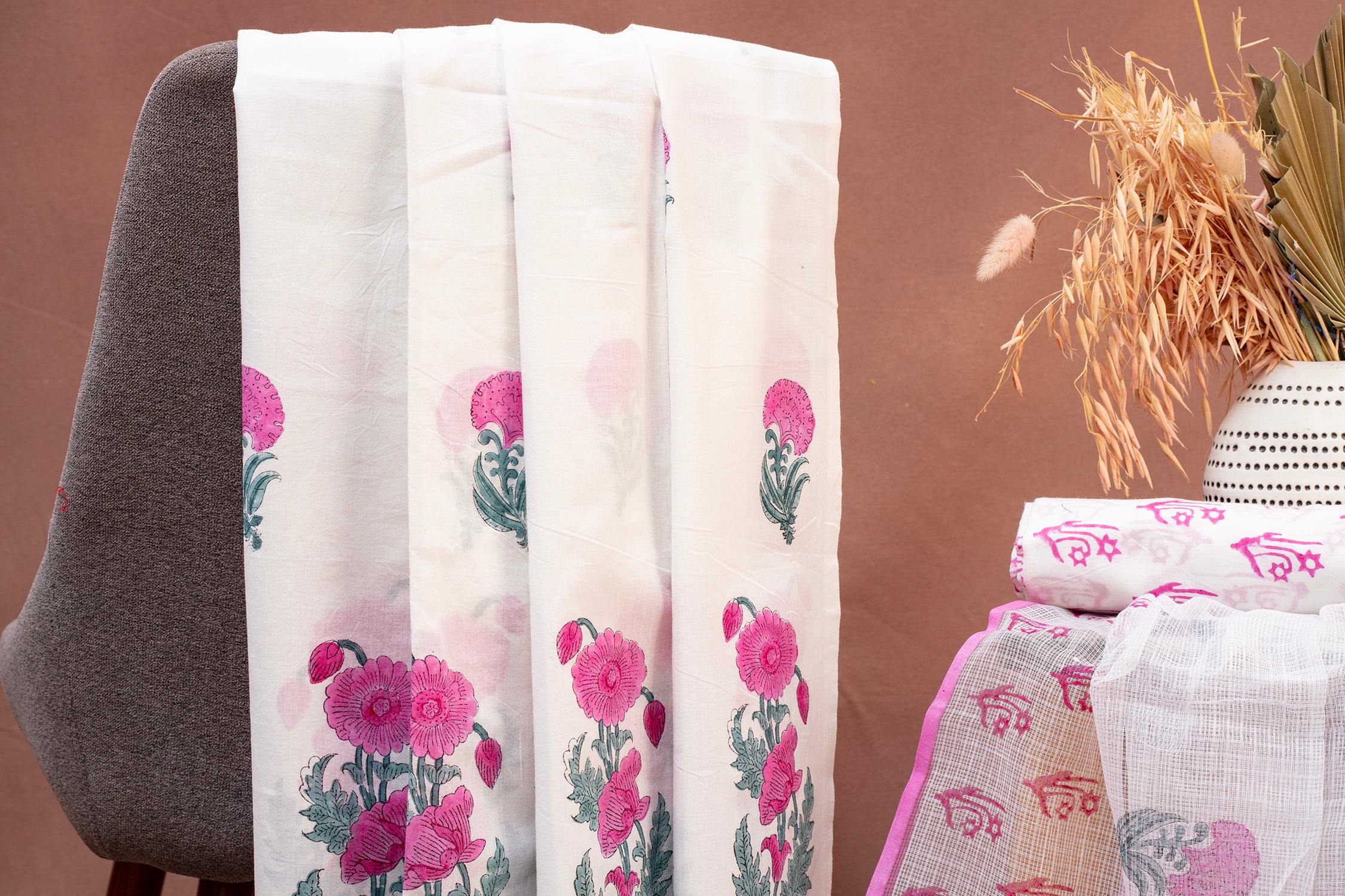 Coordinating Details: The set includes a lightweight white bottom fabric featuring dainty, scattered floral butis that provide a subtle, elegant contrast to the larger prints.