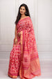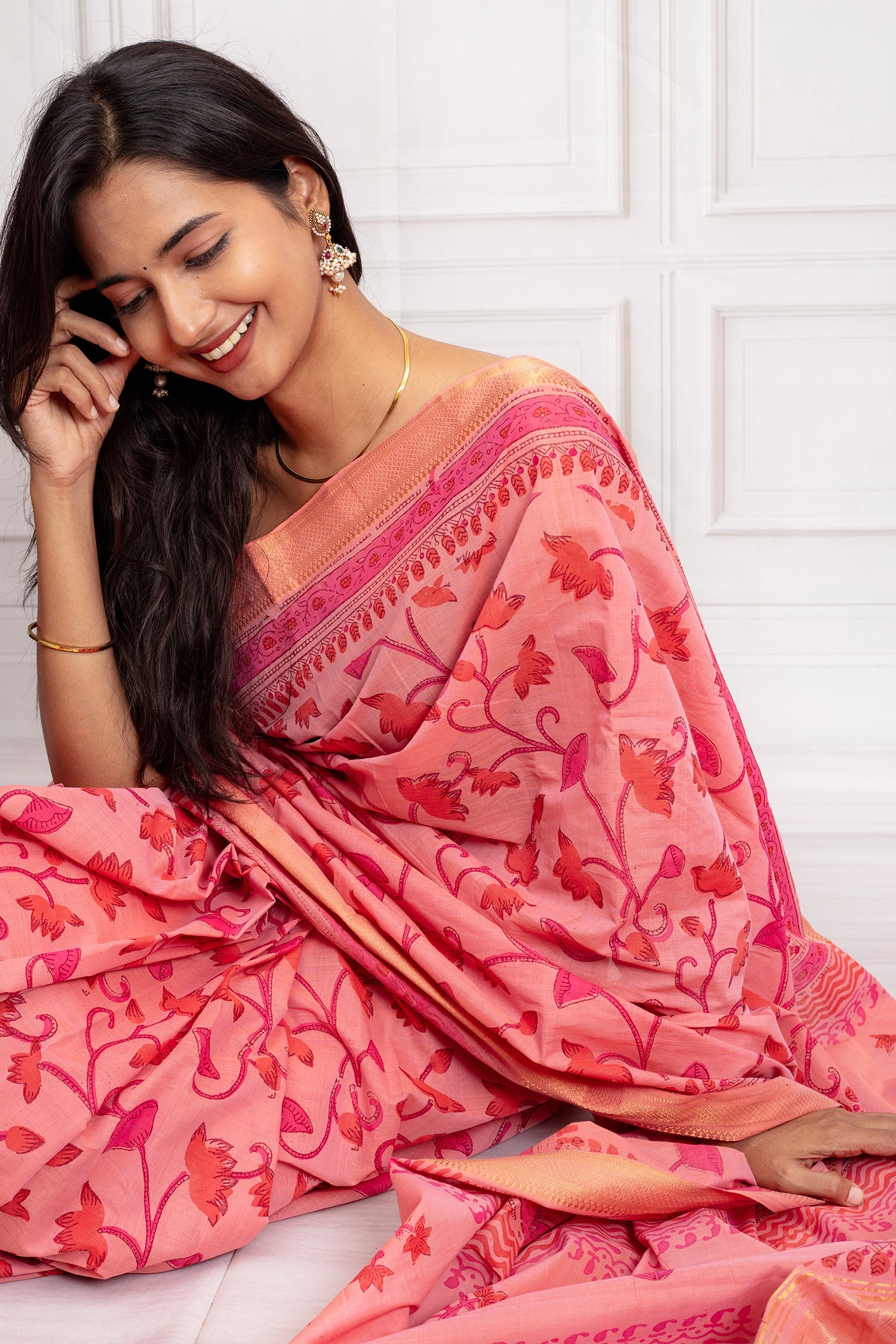 Radiant Red Cotton Saree with Golden Border Elegance Turn every occasion into a celebration of style with this stunning pure cotton saree, designed to radiate grace and sophistication. The saree features a vibrant red base adorned with subtle woven floral patterns, giving it a refined charm thatâ??s both timeless and elegant.