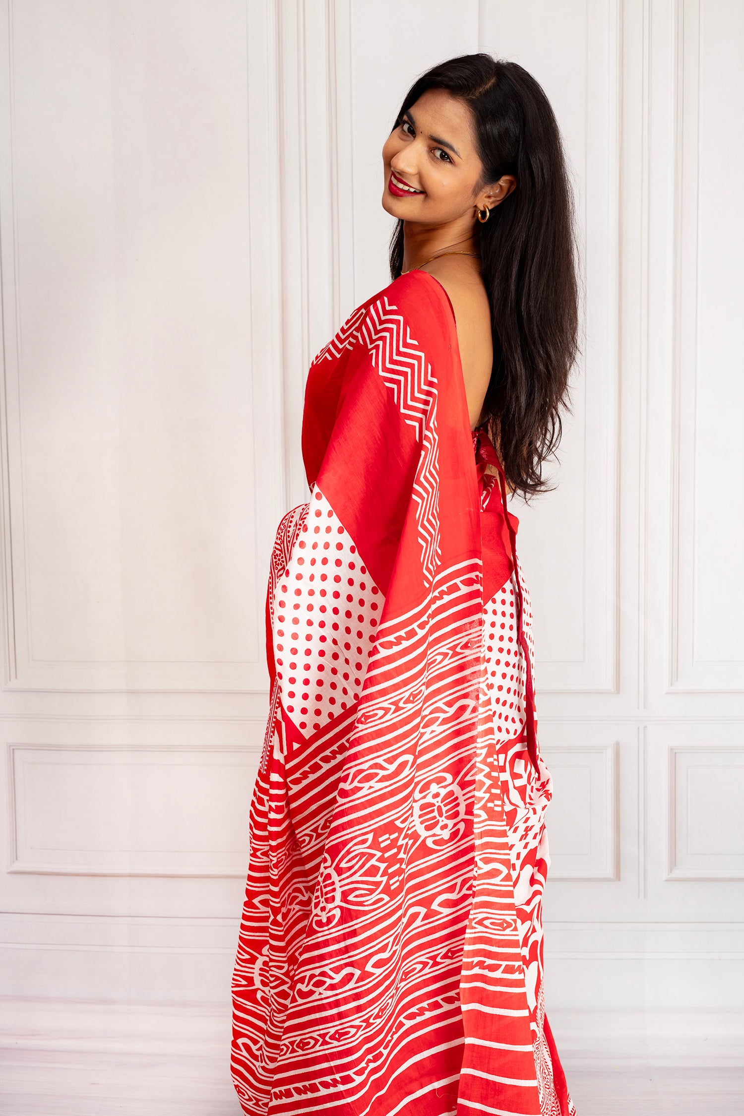 Red & White Handcrafted Cotton Saree with Artistic Prints Turn every occasion into a style statement with this stunning red and white handcrafted cotton saree, designed for women who love blending tradition with contemporary flair.
