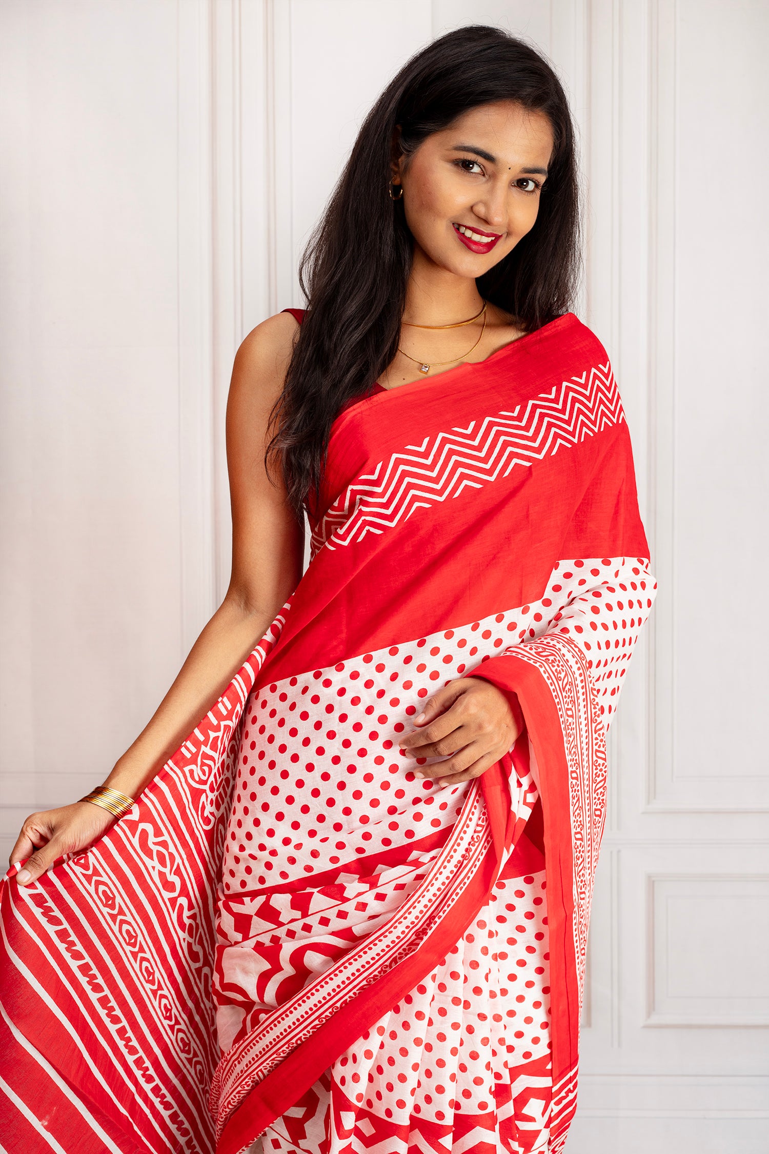 Made from premium-quality handloom cotton, this saree offers exceptional comfort and breathability while maintaining a rich and elegant drape. The saree features a vibrant red pallu and border, beautifully contrasted with a white base adorned with intricate geometric, floral, and polka print patterns, giving it a chic yet traditional appeal.