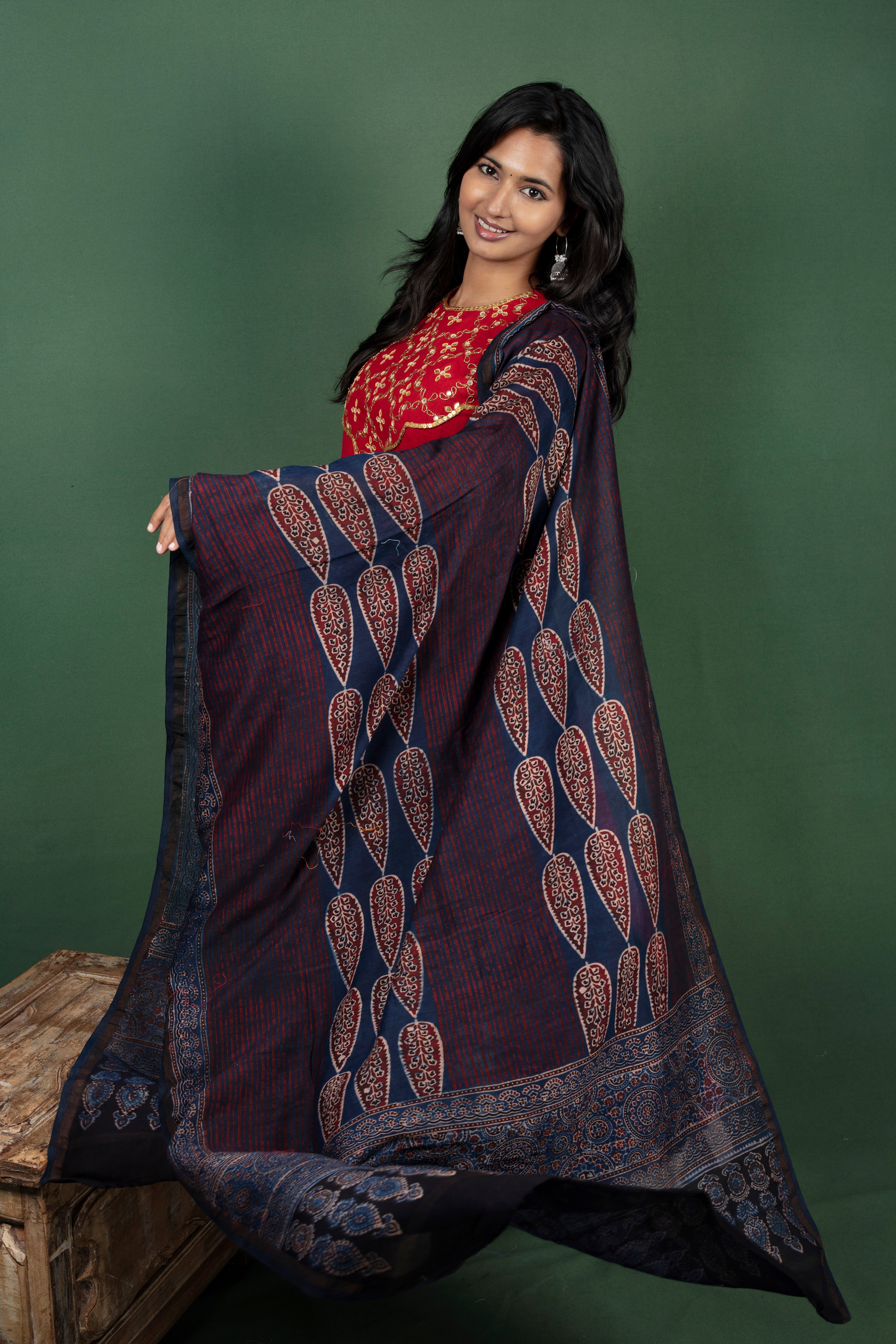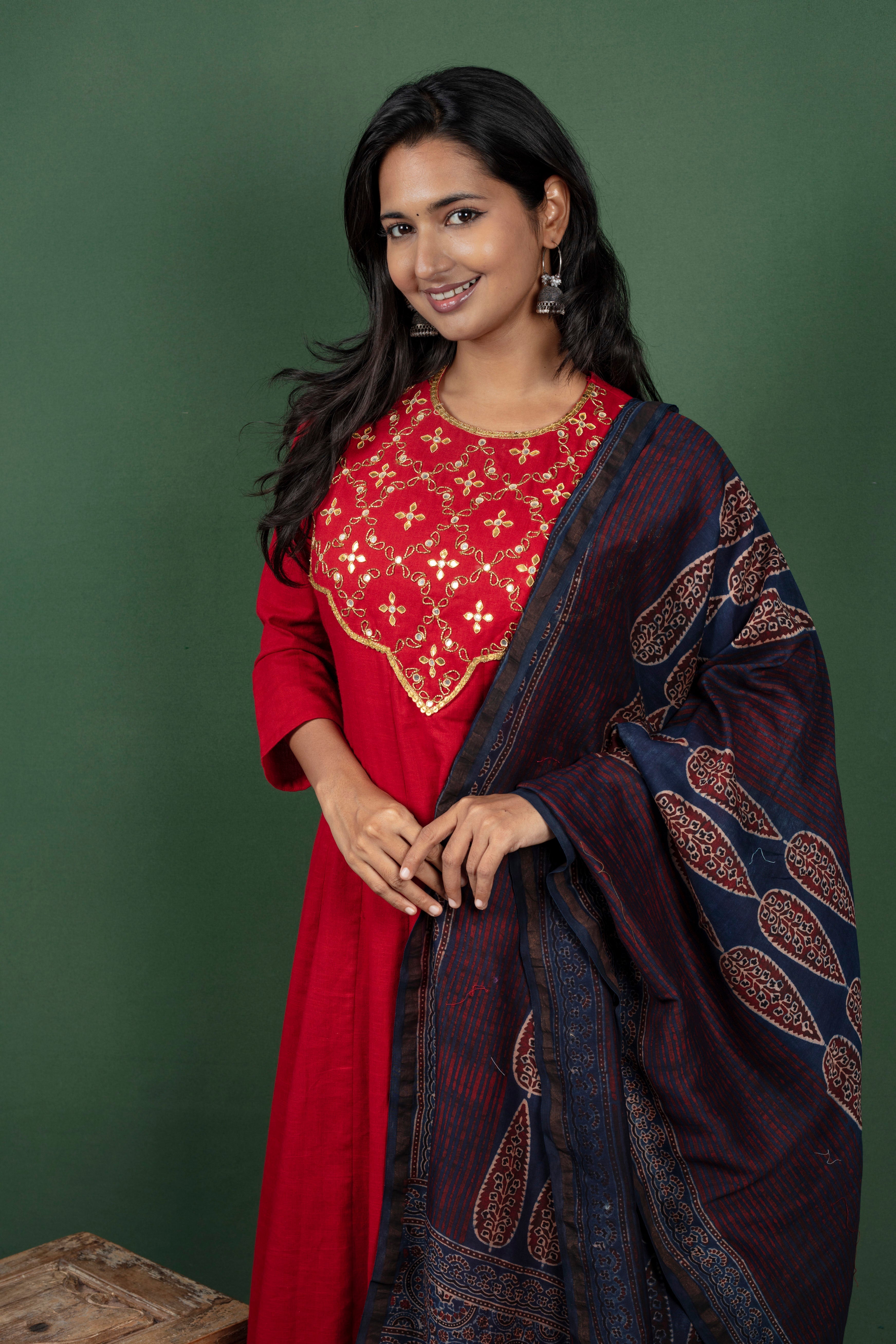 Turn heads with this "Reddish Maroon Kalidar Palazzo Suit", a perfect blend of tradition and effortless style. The delicately "embroidered Kota yoke" adds a beautiful detail to the neckline, creating a refined, graceful silhouette. Flowing kalis bring movement and elegance, while the hand-block printed dupatta offers the right balance of comfort and sophistication. Whether youâ??re dressing up for festive gatherings or intimate celebrations, this suit is designed to make a statement.