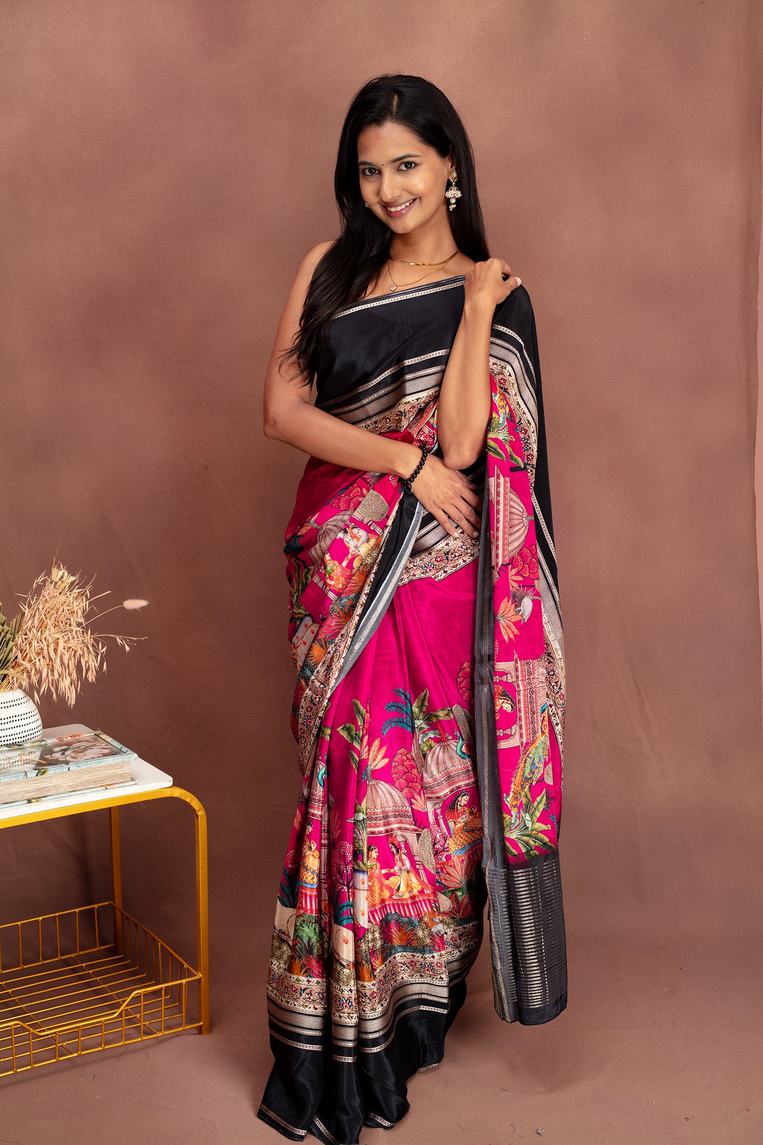 Royal Fuchsia Black Georgette Saree Drape yourself in vibrant elegance with this stunning georgette saree featuring a rich fuchsia pink base paired with a contrasting deep black pallu. The saree showcases intricate digital prints inspired by royal heritage scenes, temple motifs and floral elements, making it a perfect blend of tradition and modern storytelling. The sleek black woven border adds a refined finish, enhancing its festive charm.