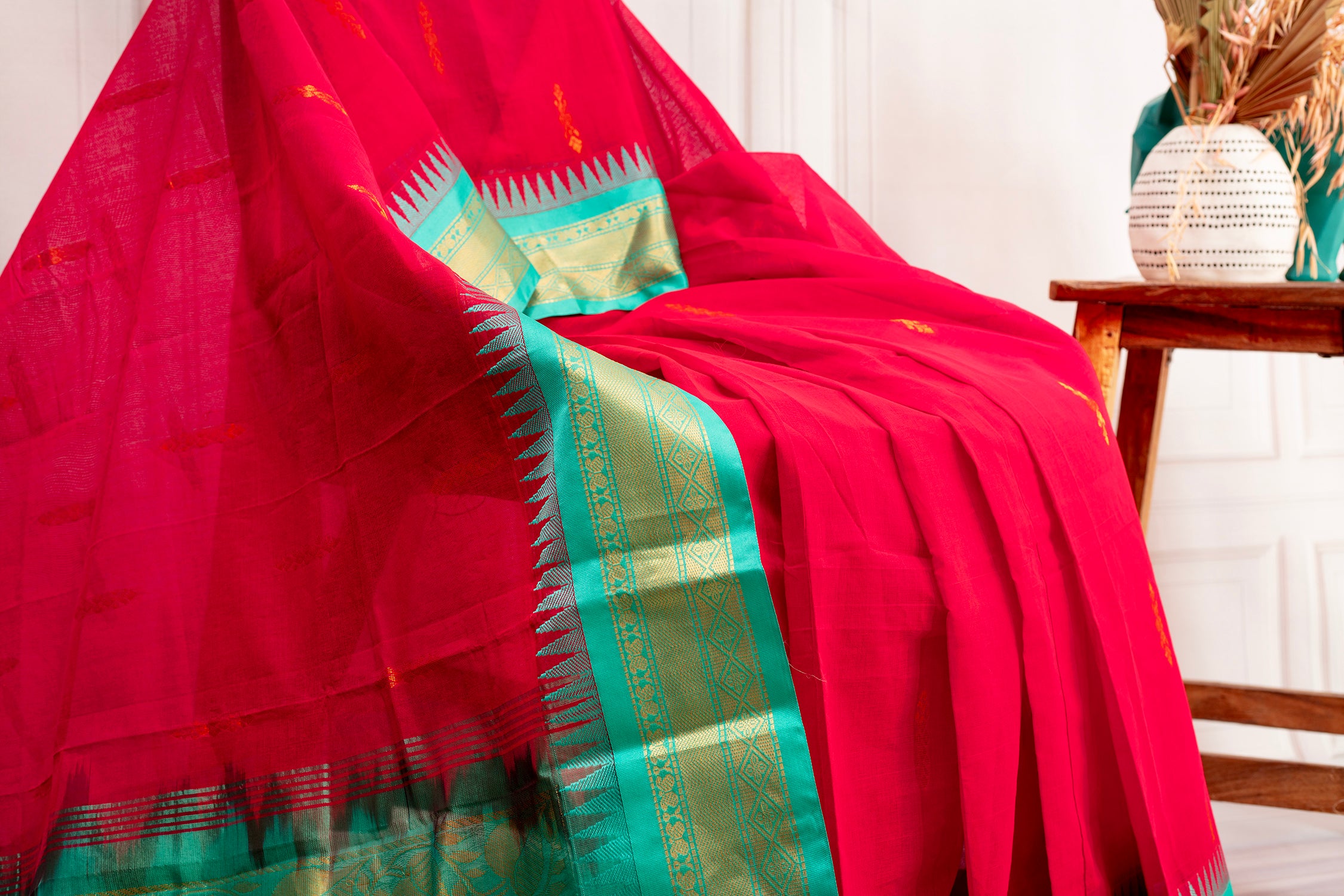 Red Silk Cotton Saree with Gold Green Zari Border & Elegant Contrast