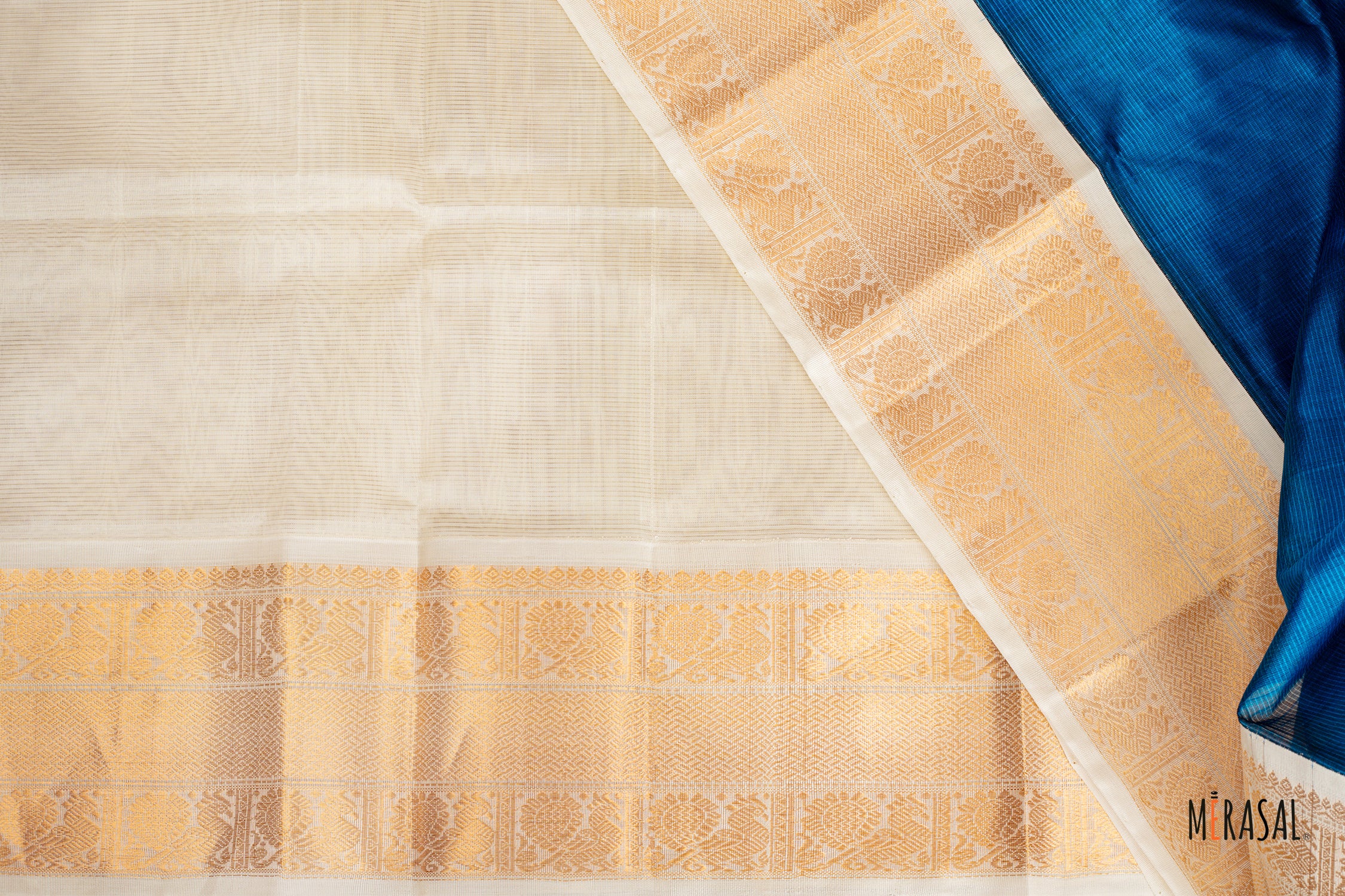 The rich teal blue body is beautifully balanced with an ivory-toned panel featuring fine gold zari stripes, adding subtle contrast and visual depth. A classic gold zari border frames the saree, lending it a refined, timeless appeal. The neatly finished tassels along the pallu enhance its handcrafted aesthetic, making it a versatile choice for both formal and semi-formal occasions.