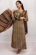 The Ajrakh Heritage Suit: A Modern Interpretation of a Timeless Craft  Embrace the rich heritage of Ajrakh with our stunning Geometric & Striped Ajrakh Suit. The straight-cut kurta features a captivating zigzag pattern in a warm palette of earthy tones, offering a modern take on a traditional print. This elegant piece is beautifully complemented by a vibrant, multi-striped dupatta. The hand-block printed stripes in shades of red, green, black, and yellow create a beautiful contrast, while the coin-work and tassel embellishments along the border add a playful, handcrafted touch. This ensemble is a perfect blend of comfort and style, ideal for a festive gathering or a cultural event.
